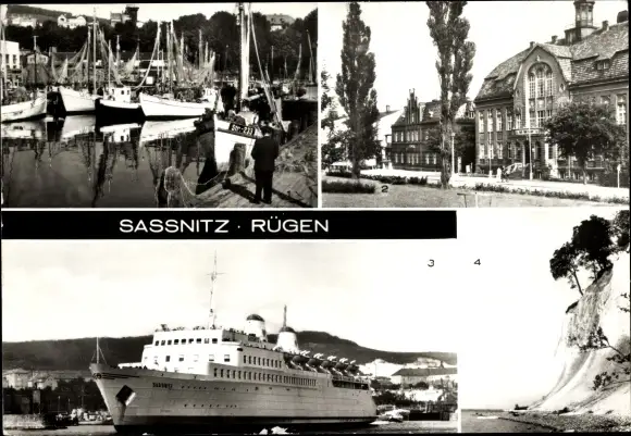 Ak Sassnitz auf Rügen, Fischereihafen, Postamt, Rathaus, Eisenbahnfährschiff MS Saßnitz