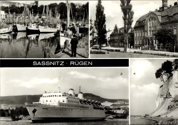 Ak Sassnitz auf Rügen, Fischereihafen, Postamt, Rathaus, Eisenbahnfährschiff MS Saßnitz
