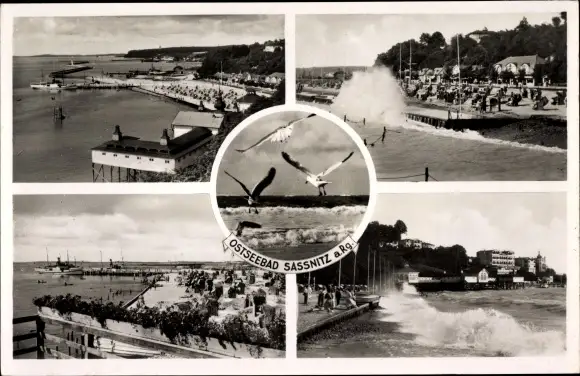 Ak Sassnitz auf Rügen, Strand, Brandung, Seebrücke, Möwen