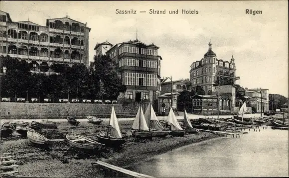 Ak Sassnitz auf Rügen, Strand, Hotel, Segelboote