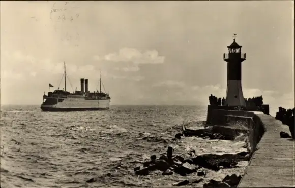 Ak Sassnitz auf der Insel Rügen, Leuchtturm mit Schwedenfähre