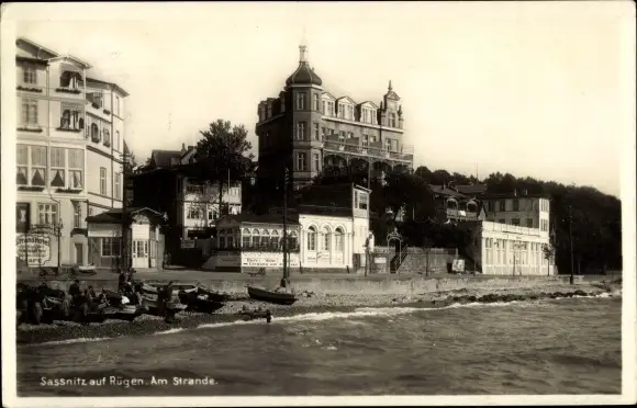 Ak Sassnitz auf der Insel Rügen, Strand, Ruderboote, Strandhotel