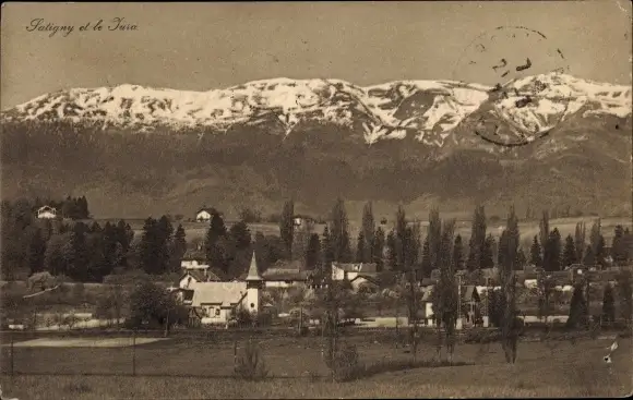 Ak Satigny Kanton Genf Genève, Blick auf Ort und Jura-Massiv