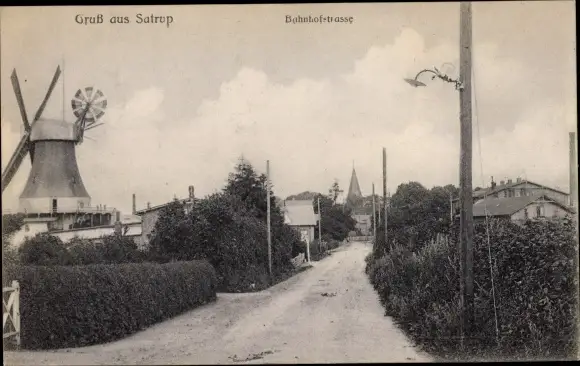 Ak Satrup in Angeln, Bahnhofstraße, Windmühle