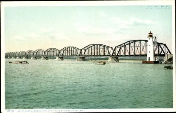 Ak Sault Sainte-Marie Michigan USA, Internationale Brücke und Leuchtturm