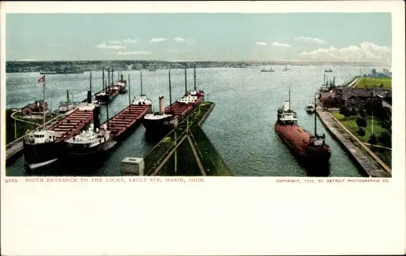 Ak Sault Sainte Marie Michigan USA, Südeingang zu den Schleusen