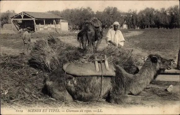 Ak Scenes et Types, Chameau au repos, Kamel, Maghreb