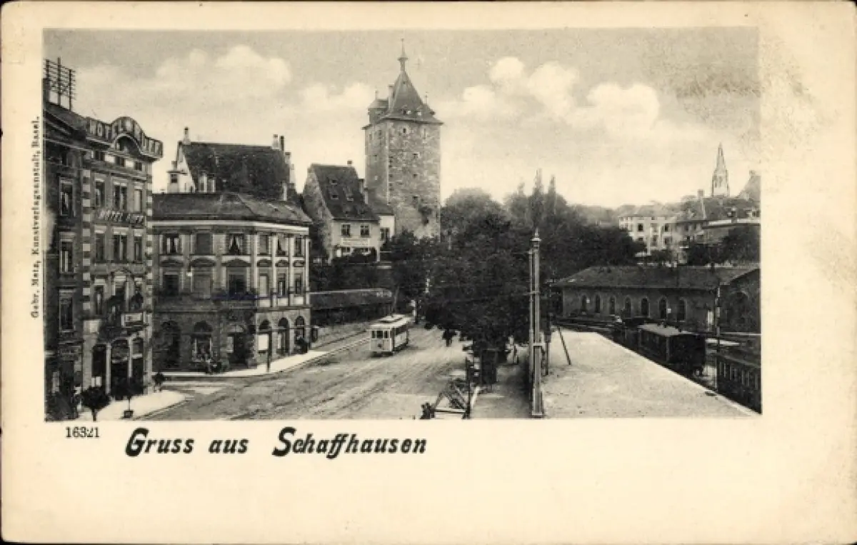 Ak Schaffhausen am Rhein Schweiz, Straßenbahn, Häuser, Turm