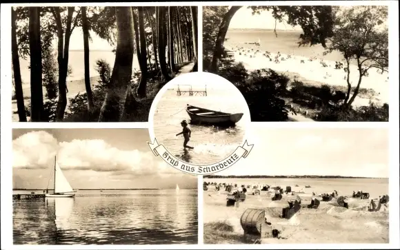 Ak Scharbeutz, Blick auf das Meer, Strand, Segelboot, Waldpartie