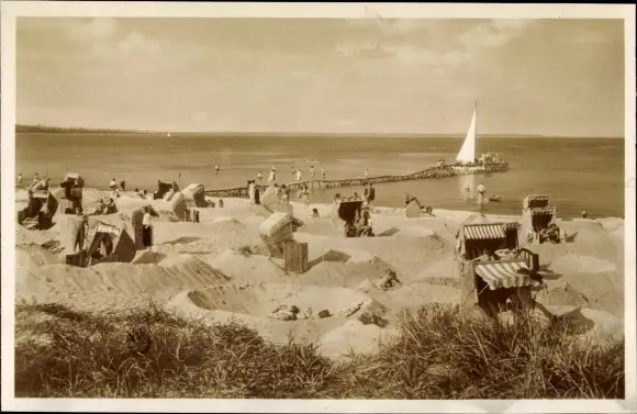 Ak Scharbeutz in Ostholstein, Strand, Strandkörbe, Segelboot