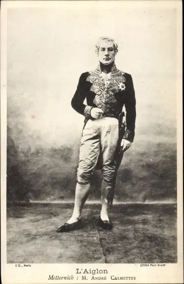 Ak Schauspieler Andre Calmettes, Portrait als Metternich, L'Aiglon, Theaterszene