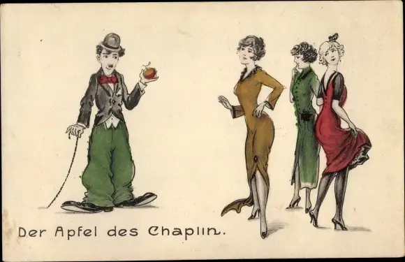 Ak Schauspieler Charlie Chaplin, Der Apfel des Chaplin, drei Frauen