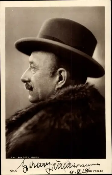 Ak Schauspieler Hans Junkermann, Portrait im Profil, Hut, Pelzkragen, Autogramm