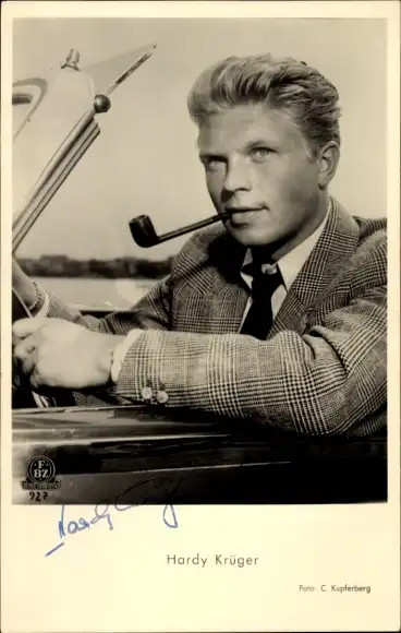 Ak Schauspieler Hardy Krüger, Portrait, Autogramm, Pfeife, Auto