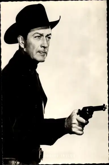 Ak Schauspieler Robert Taylor, Portrait, Cowboyhut, Revolver