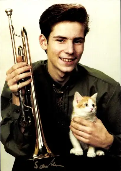 Ak Schauspieler Torsten Benkenstein, Portrait mit Musikinstrument und Kätzchen, Autogramm
