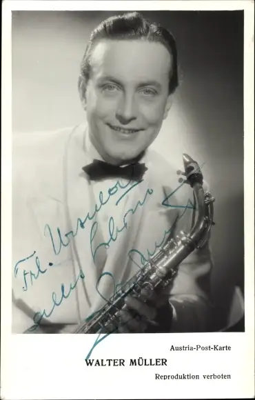 Ak Schauspieler Walter Müller, Portrait mit Saxophon, Autogramm