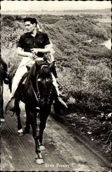 Ak Schauspieler und Sänger Elvis Presley, auf einem Pferd reitend