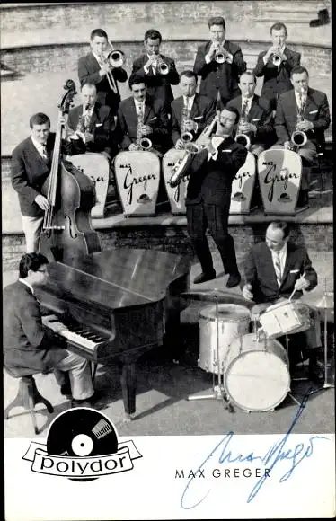 Ak Schauspieler und Sänger Max Greger, Portrait mit Orchester, Autogramm