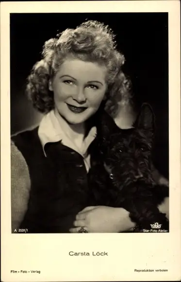 Ak Schauspielerin Carsta Löck, Portrait mit schwarzem Terrier
