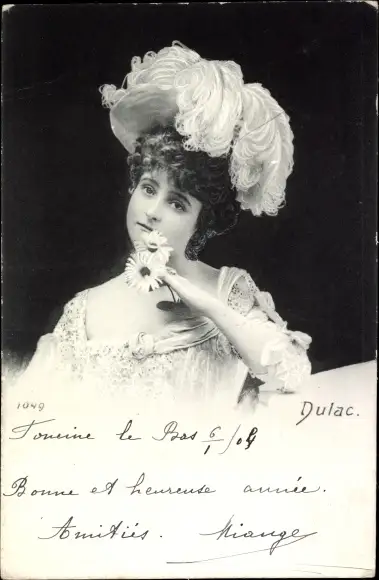 Ak Schauspielerin Dulac, Portrait mit Federhut