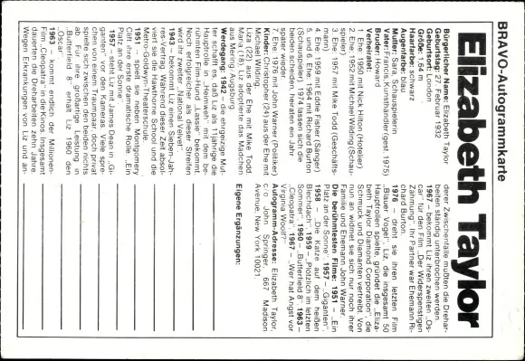 Ak Schauspielerin Elizabeth Taylor, Portrait, BRAVO, Autogramm