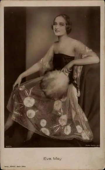 Ak Schauspielerin Eva May, Sitzportrait, Fächer aus Federn