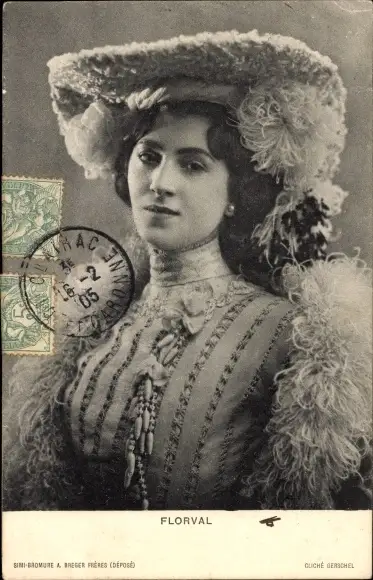 Ak Schauspielerin Florval, Portrait, Hut, Federboa
