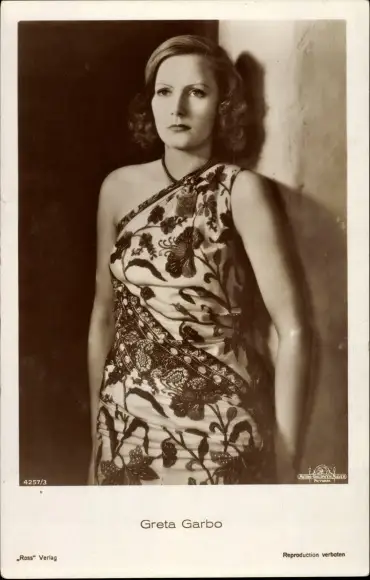 Ak Schauspielerin Greta Garbo, Standportrait, Kleid, Ross
