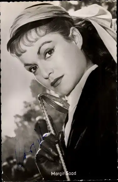 Ak Schauspielerin Margit Saad, Portrait mit Reitgerte, Autogramm