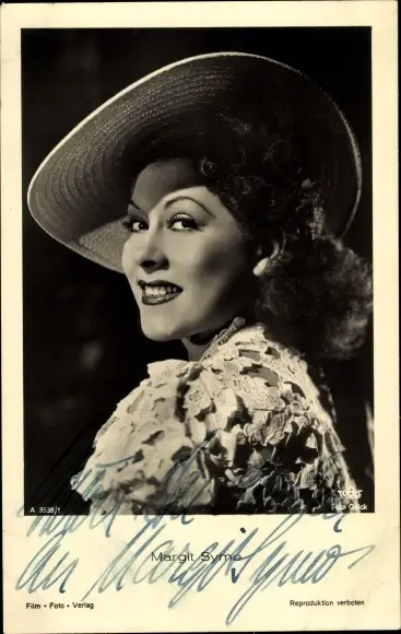 Ak Schauspielerin Margit Symo, Portrait mit Hut, Autogramm