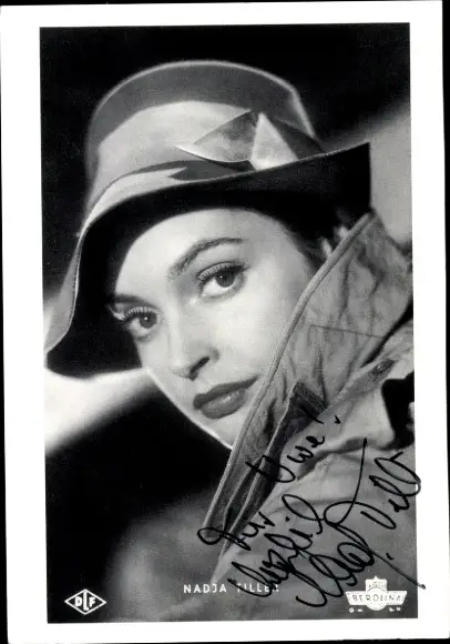 Ak Schauspielerin Nadja Tiller, Portrait, Autogramm, Hut, Mantel