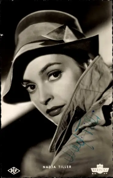Ak Schauspielerin Nadja Tiller, Portrait, Hut, Mantel, Autogramm