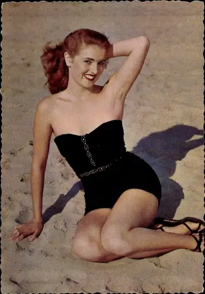 Ak Schauspielerin, sitzend im Badeanzug am Strand