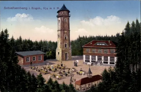 Ak Scheibenberg Erzgebirge, Gasthof mit Turm, Terrasse