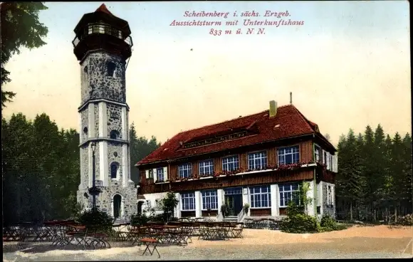 Ak Scheibenberg Sachsen, Aussichtsturm, Unterkunftshaus
