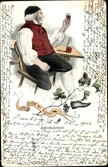 Ak Schenkelewirt, Suffe wi bigott, Mann trinkt Wein