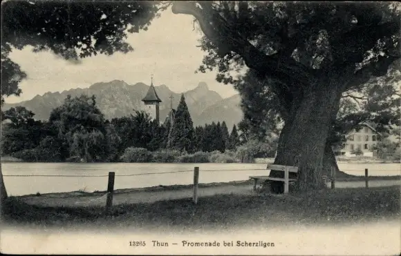 Ak Scherzligen Strättligen Thun Kt. Bern Schweiz, Promenade, Kirchturm
