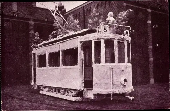 Ak Scheveningen Den Haag Südholland, De Winter, geschmückte Straßenbahn