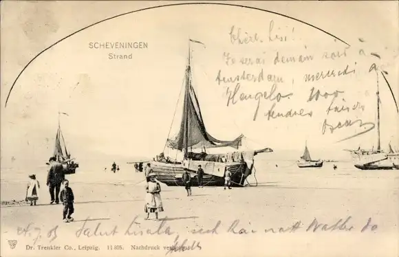 Ak Scheveningen Den Haag Südholland, kleines Segelboot am Strand