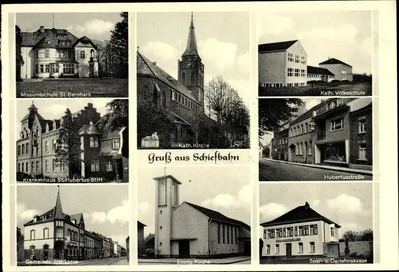 Ak Schiefbahn Willich am Niederrhein, Missionsschule St. Bernhard, Evang. Kirche, Kath. Volksschule