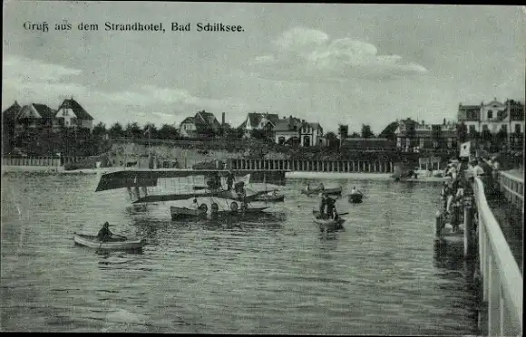 Ak Schilksee Kiel, Strandhotel, Boote, Wasserflugzeug