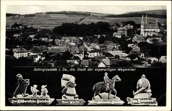 Ak Schirgiswalde Kirschau in der Lausitz, Wegweiser, Totalansicht der Ortschaft