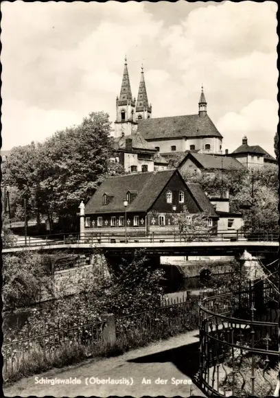 Ak Schirgiswalde in der Lausitz, An der Spree, Brücke, Kirche