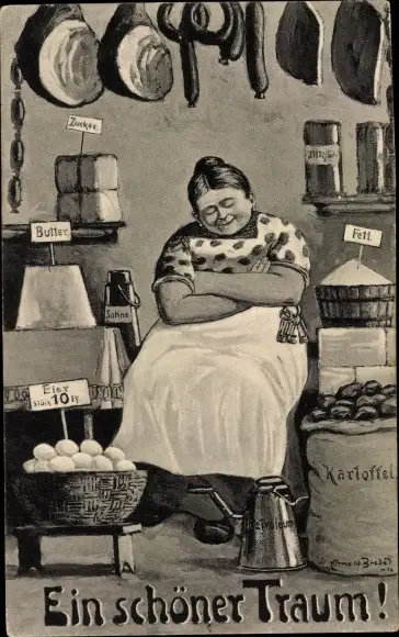 Ak Schlafende Frau im Lebensmittelladen, Ein schöner Traum, Kartoffeln, Fett, Wurstwaren