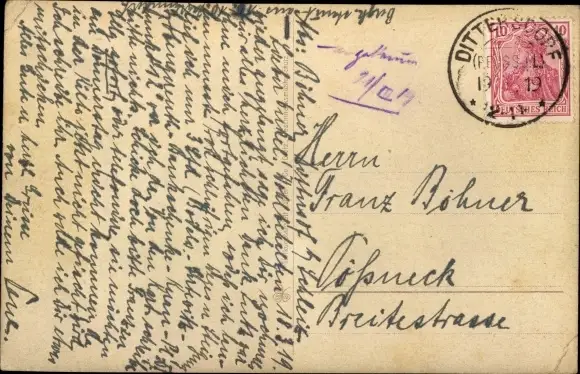 gelaufen 1919, Eckknicke, fleckig, sonst guter Zustand