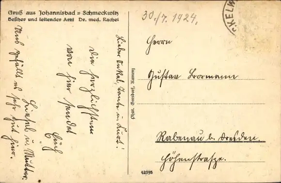 Zustand, siehe Scan, gelaufen, 1924- Inh. Dr. med. Rachel - ca 14 cm X 9 cm