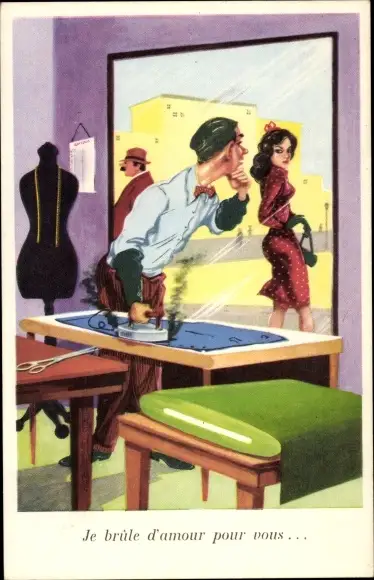 Ak Schneider mit Bügeleisen schaut einer Frau hinterher, verbrannter Stoff