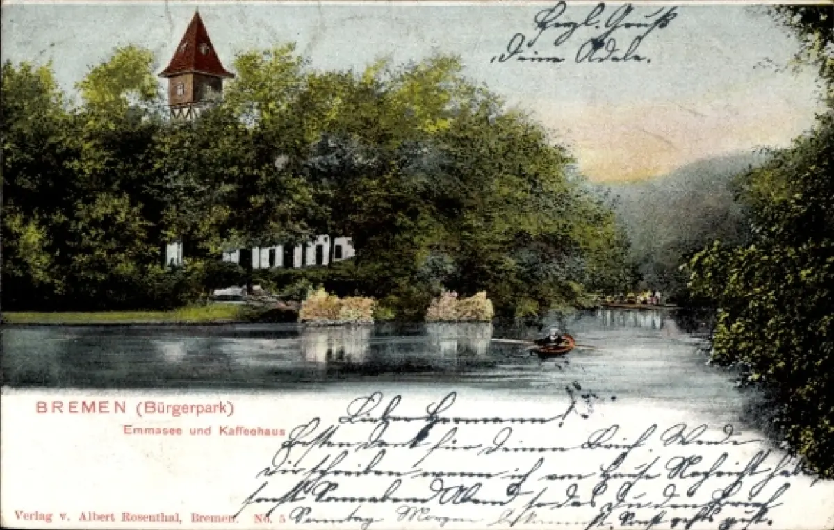 Ak Schnoor Bremen, Bürgerpark, Emmasee, Kaffeehaus, Boot auf dem Wasser
