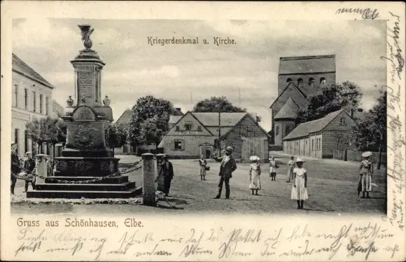 Ak Schönhausen an der Elbe, Kriegerdenkmal, Kirche